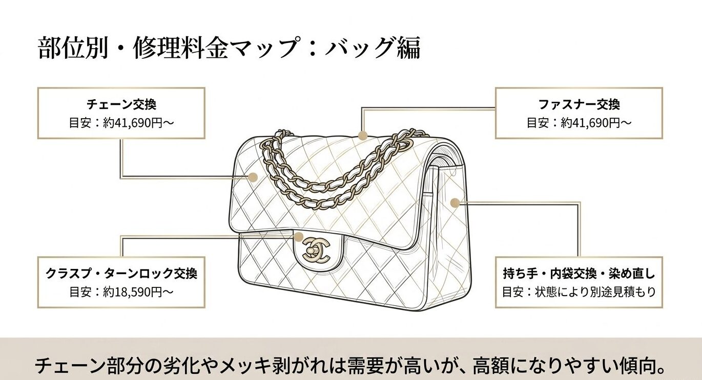 シャネルのバッグ修理で最も費用がかかりやすいのはチェーン交換で、約41,690円〜が目安となります。
